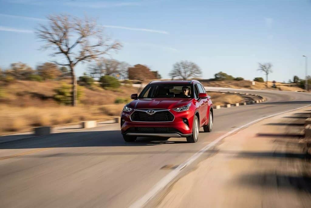 2020 Toyota Highlander Hybrid XLE AWD driving on a curved road in a rural landscape