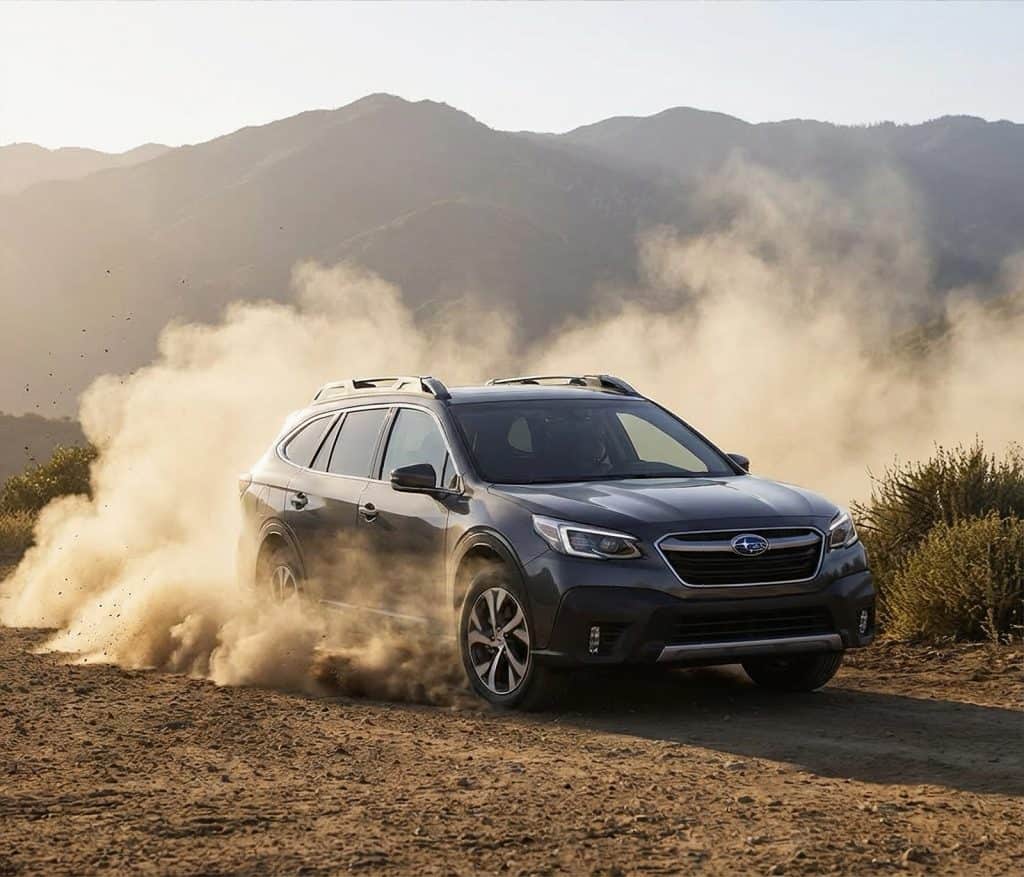 2022 Subaru Outback Limited XT AWD driving on a dusty off-road trail with mountains in the background