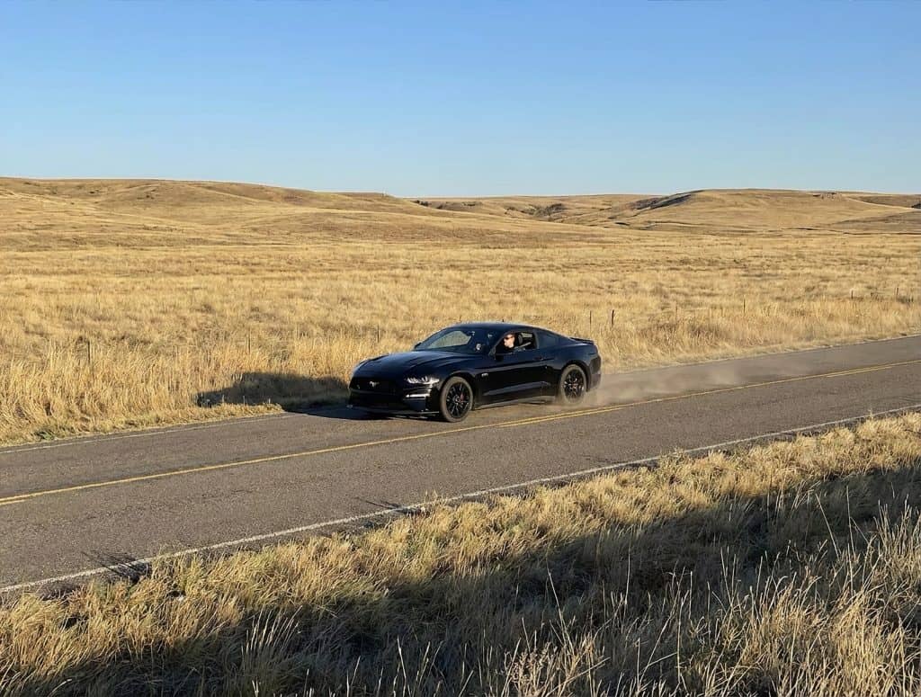 2023 Ford Mustang EcoBoost driving on an open rural road surrounded by dry grassland