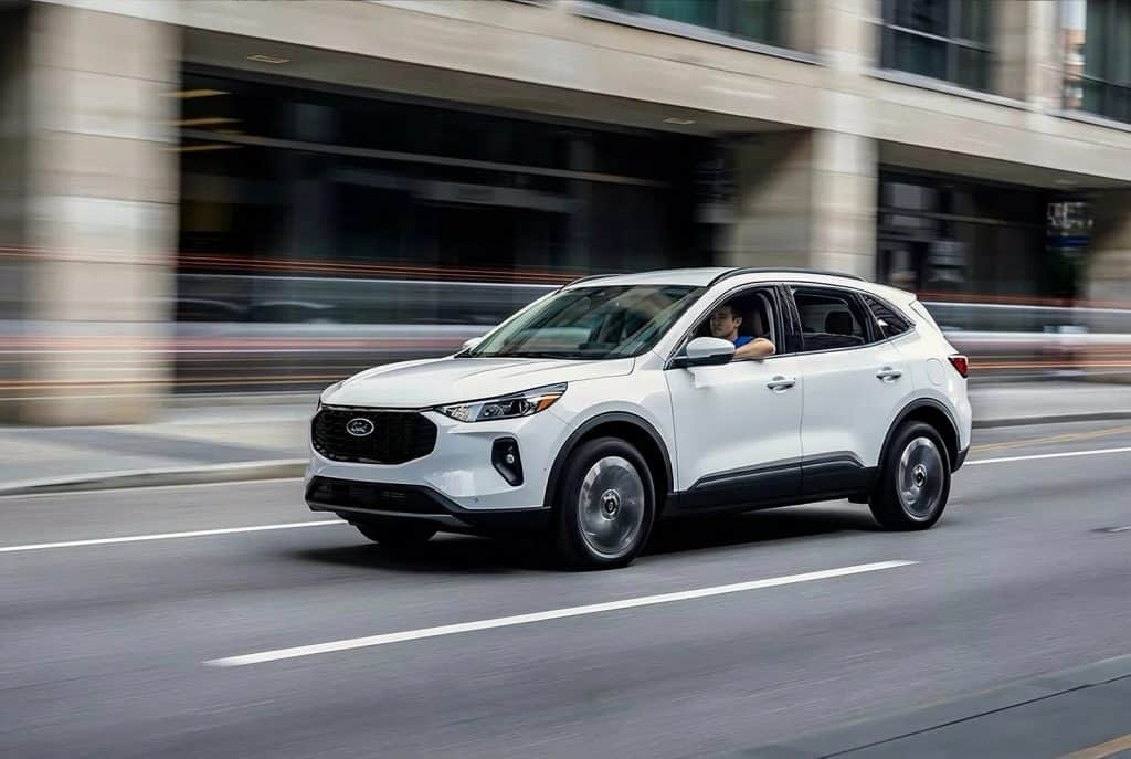 2024 Ford Escape Platinum AWD driving through a city street with motion blur in the background