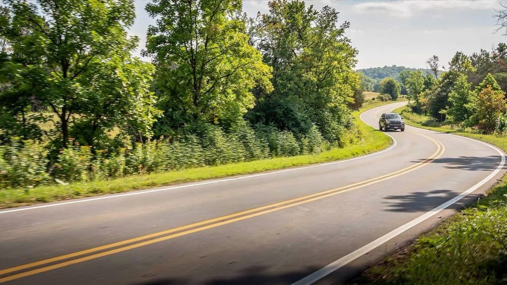 2024 Jeep Grand Cherokee Limited driving along a winding road surrounded by green trees