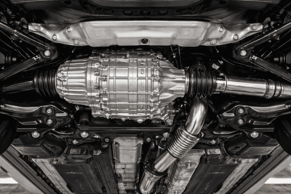 Vehicle underside showing the transmission and drivetrain components in a clean, educational view