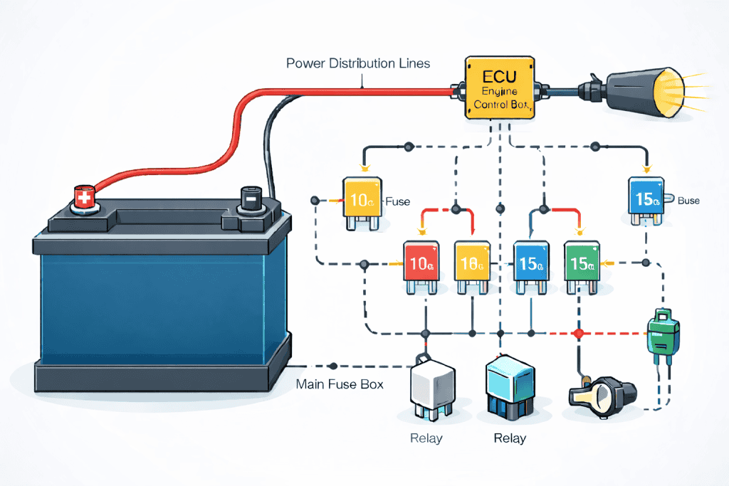Fuse-related problems frequently explain warning signs such as accessories failing without warning, dashboard alerts appearing briefly, or systems working intermittently. The fuse box layout illustration shown on this page highlights how power flows from the battery through individual fuses and relays before reaching vehicle systems.