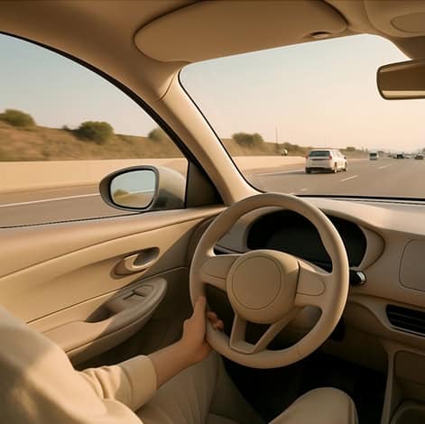 Interior view of a driver maintaining steady speed on a highway, illustrating how driving habits affect fuel consumption