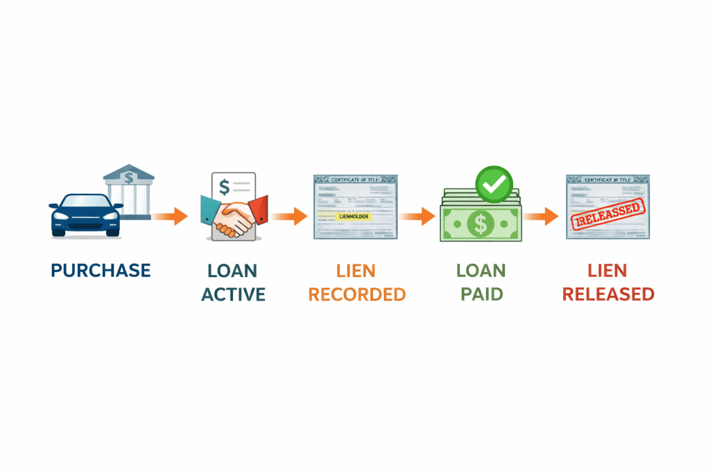 Diagram showing how a car loan leads to a lien on the title and how payoff results in lien release and a clear title.