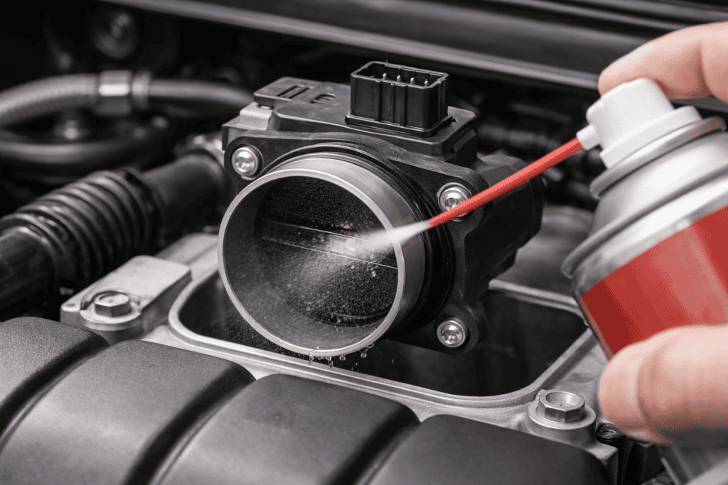 Close-up of Mass Air Flow (MAF) cleaner being sprayed onto the sensor element during cleaning inside a clean engine bay.