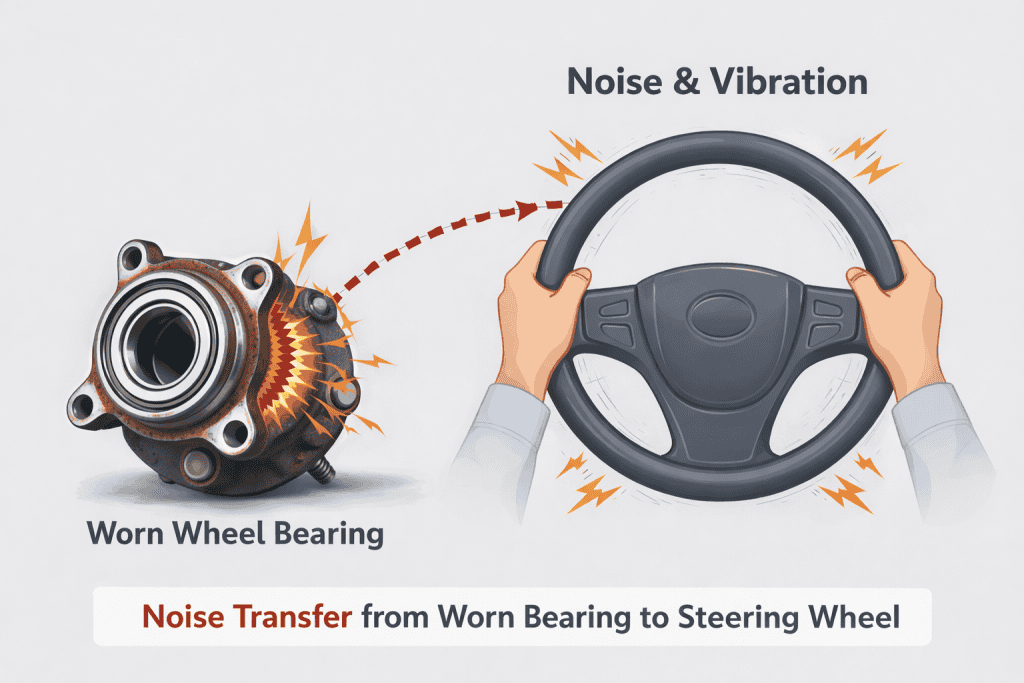 through the suspension to the steering wheel, explaining common wheel bearing symptoms.