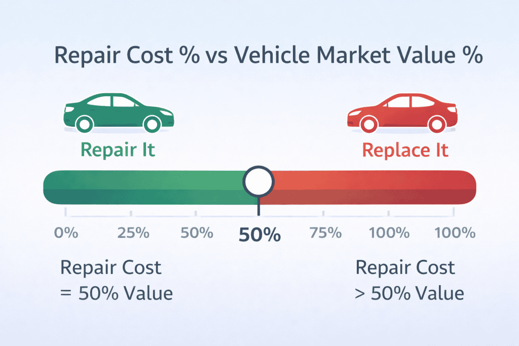 Repair cost vs vehicle value infographic showing 50% repair threshold for replacement