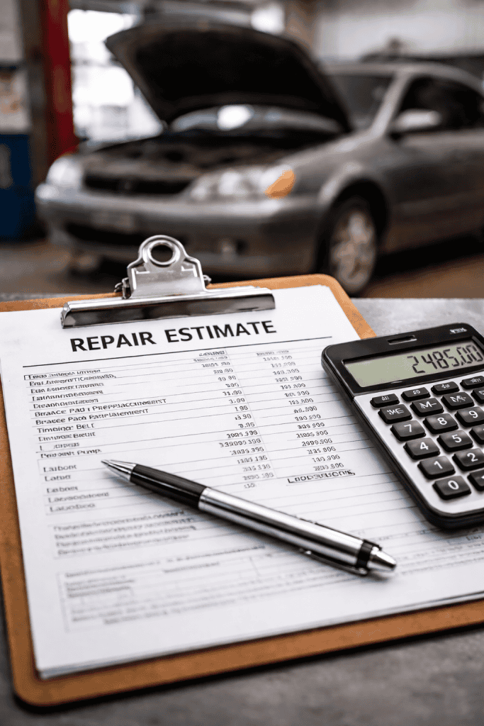 Repair estimate document on clipboard with calculator beside it and blurred vehicle with open hood in auto repair shop background