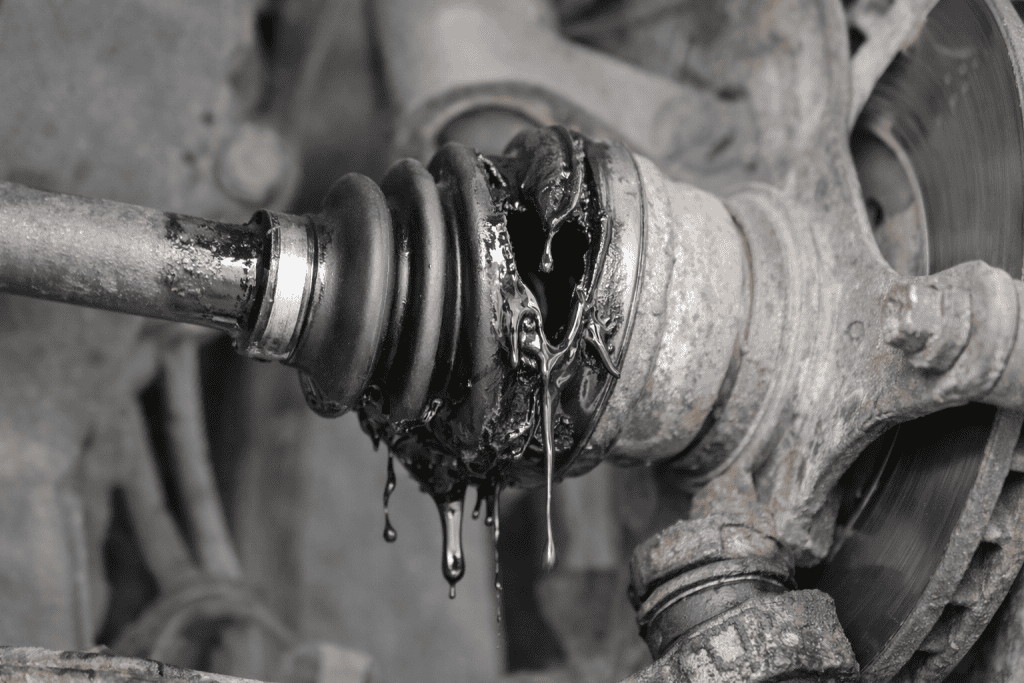 Close-up photo of a torn CV boot leaking grease around the axle and wheel hub, showing a common visual sign of CV joint failure.