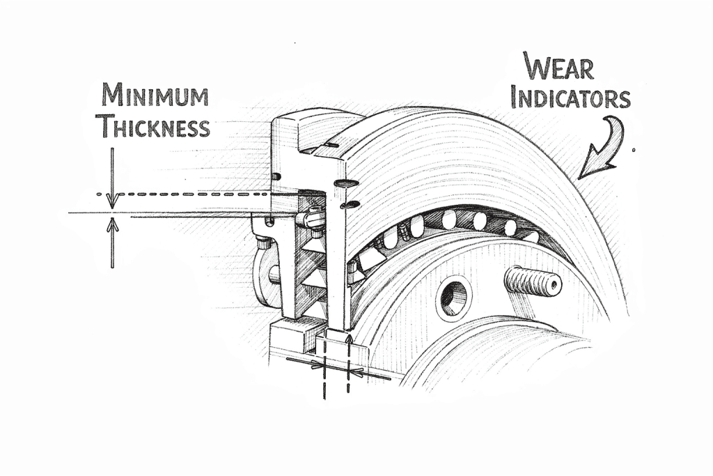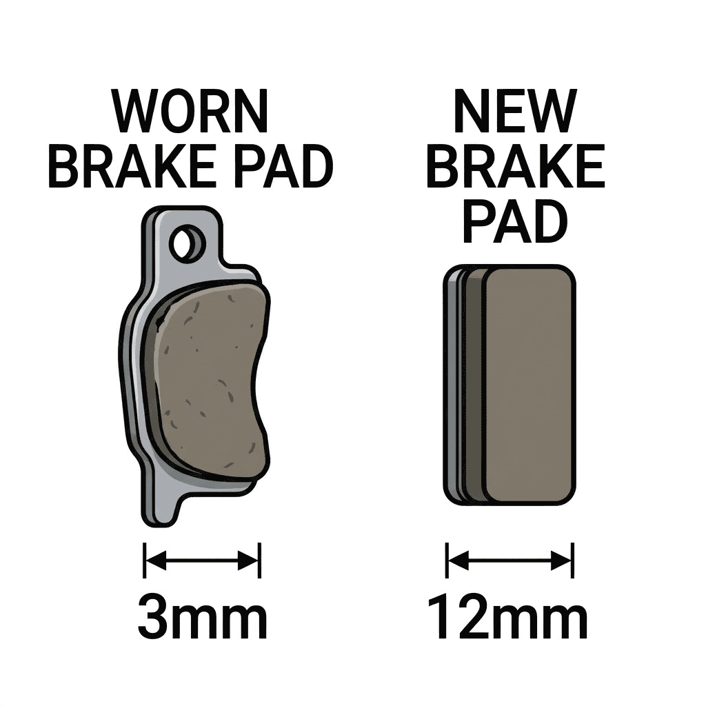 • Visual check: Look through the wheel or remove it to see pad thickness. If friction material is around the thickness of the backing plate or less (often near or under 3–4 mm), it’s time to replace.