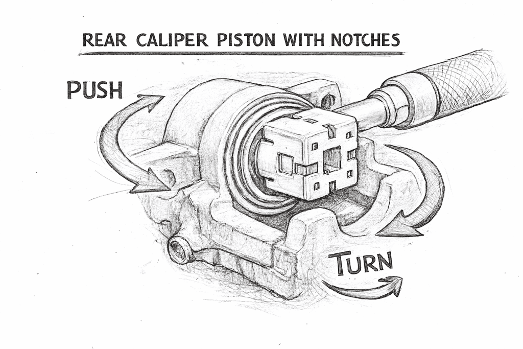 • Some rear calipers require the piston to be rotated while being pushed in using a special cube tool or manufacturer‑specific tool.