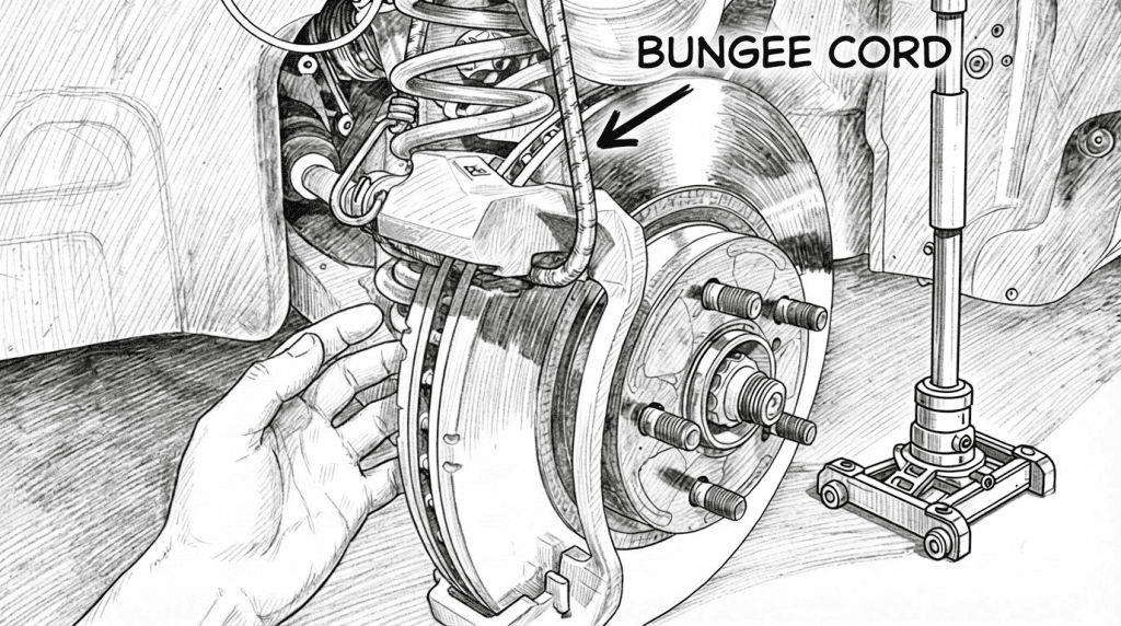 • Support the caliper with a hook, bungee cord, or wire from the suspension spring.