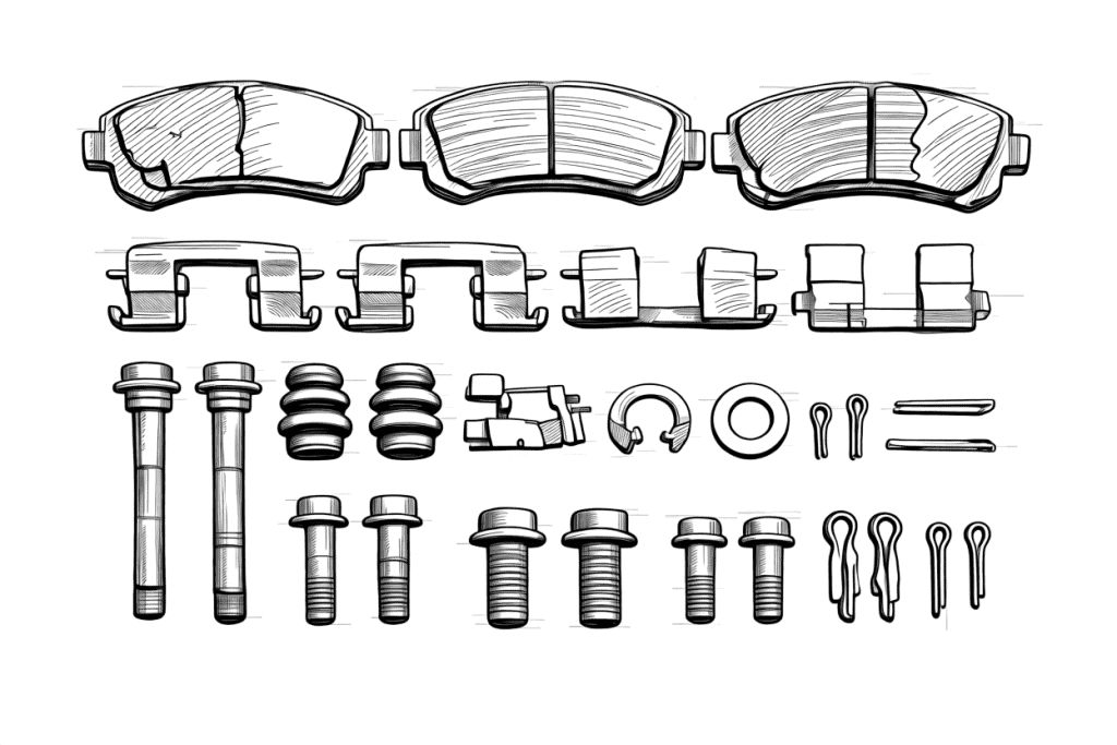 • Brake hardware kit — Includes pad clips, shims, and anti-rattle springs (highly recommended)